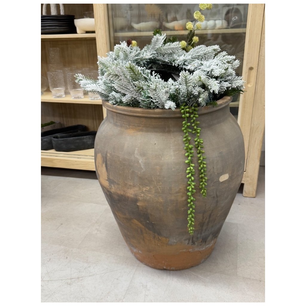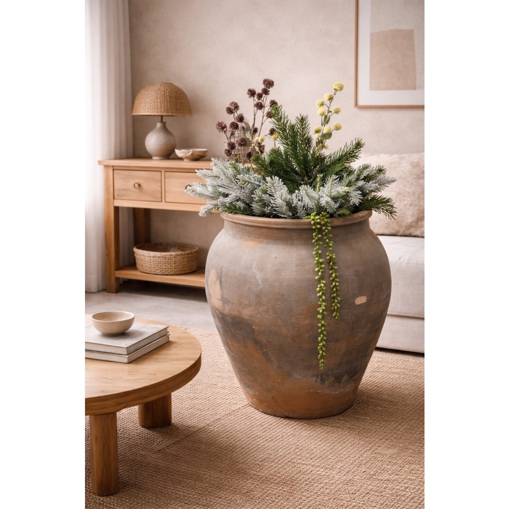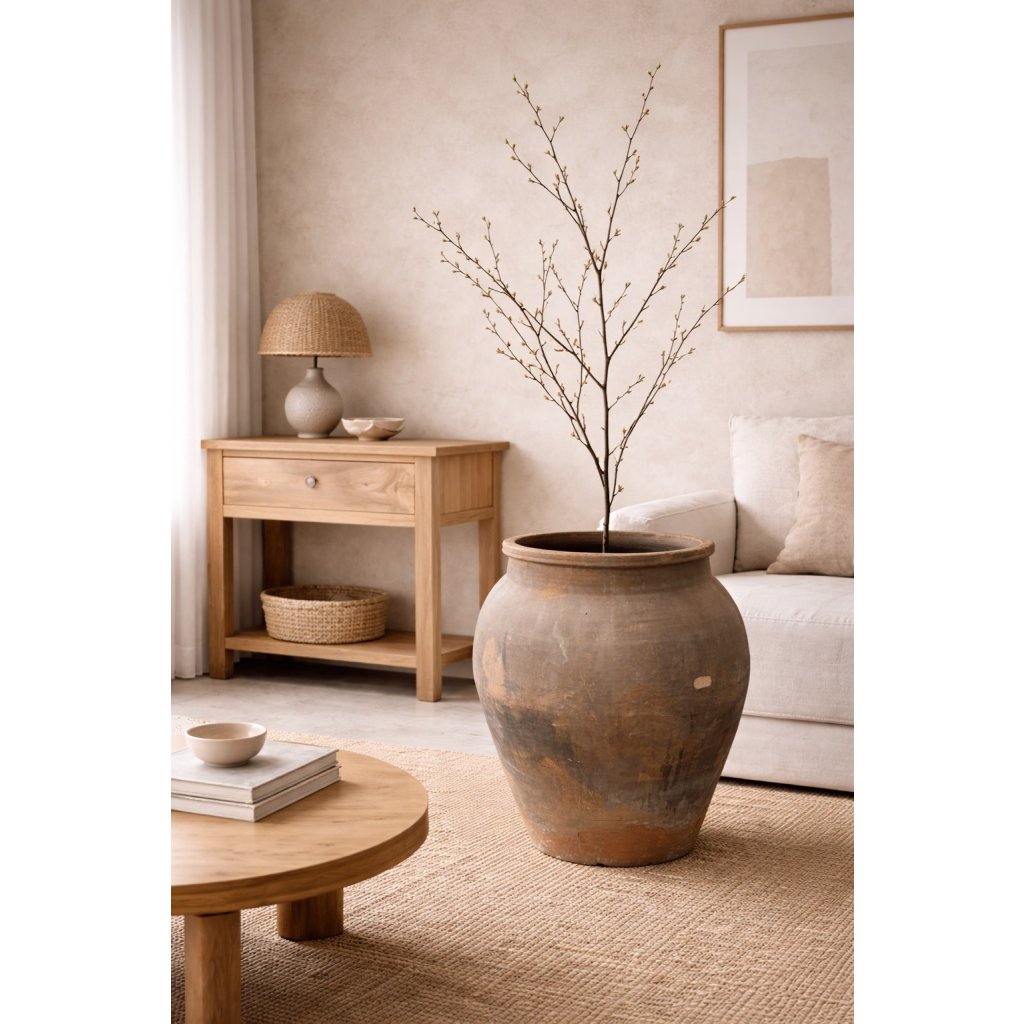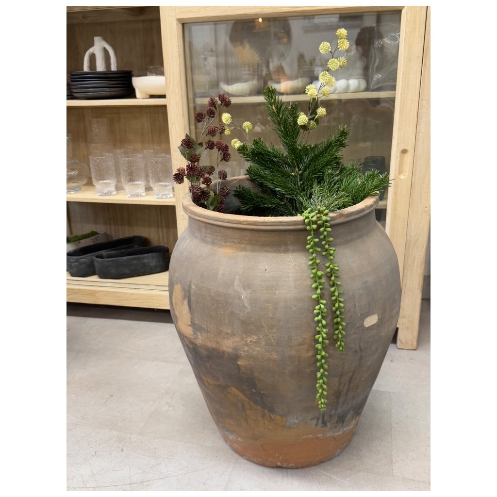 Tato impozantní amfora přináší do interiéru i exteriéru kus historie, ručního řemesla a krásu nedokonalosti. Pochází z Indie, de byla tradiční technikou vytvořena z masivní hlíny a následně vypálena tak, aby získala svůj autentický, nepravidelný vzhled typický pro styl wabi - sabi.