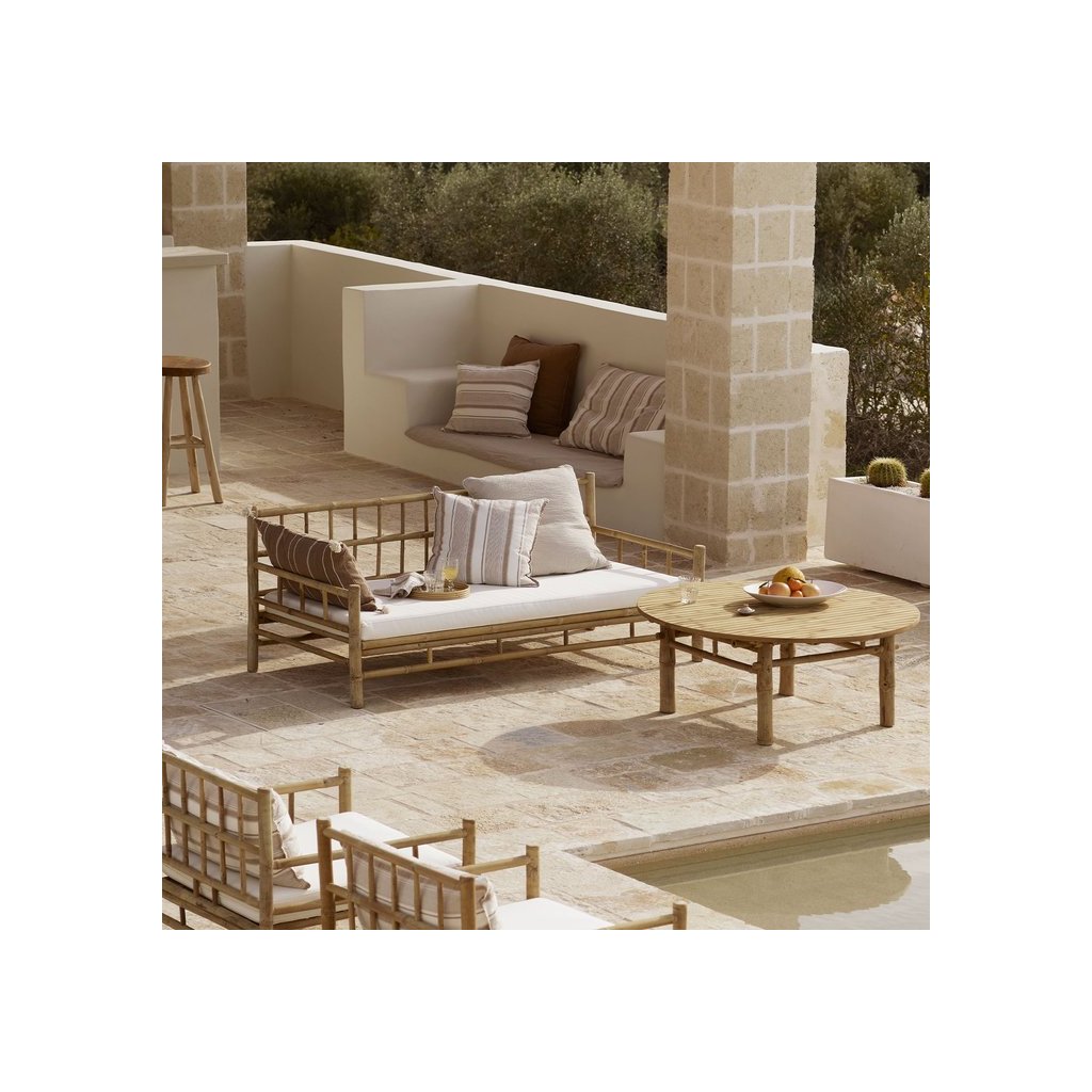 Pohovka je ručně vyráběná z kvalitního přírodního bambusu, který je ceněný pro svou pevnost, lehkost a dlouhou životnost. Jemná struktura materiálu a čisté linie vytváří nadčasový kus nábytku, který přirozeně zapadne do moderních interiérů i stylových venkovních prostor.