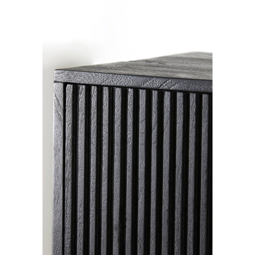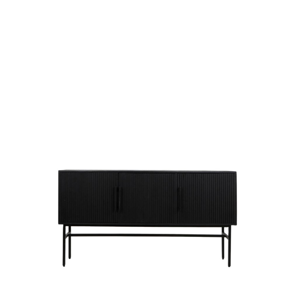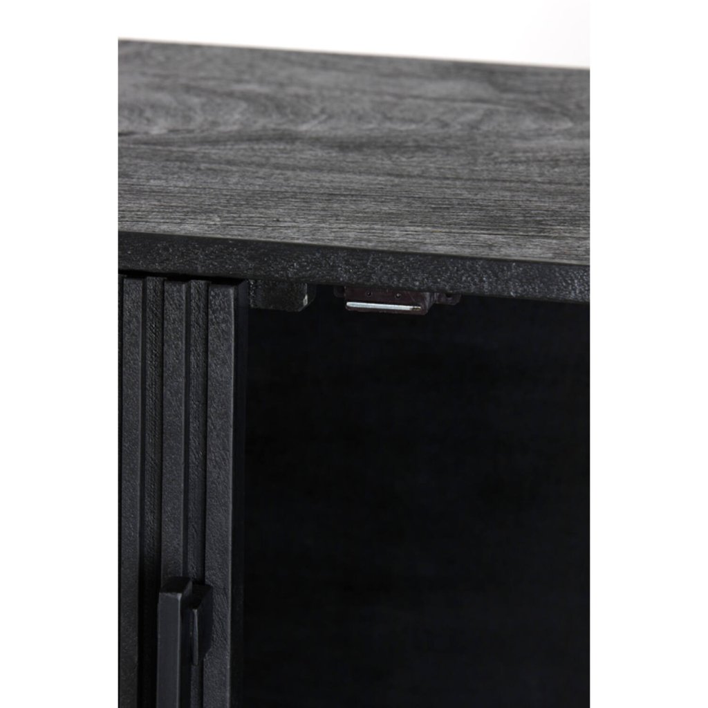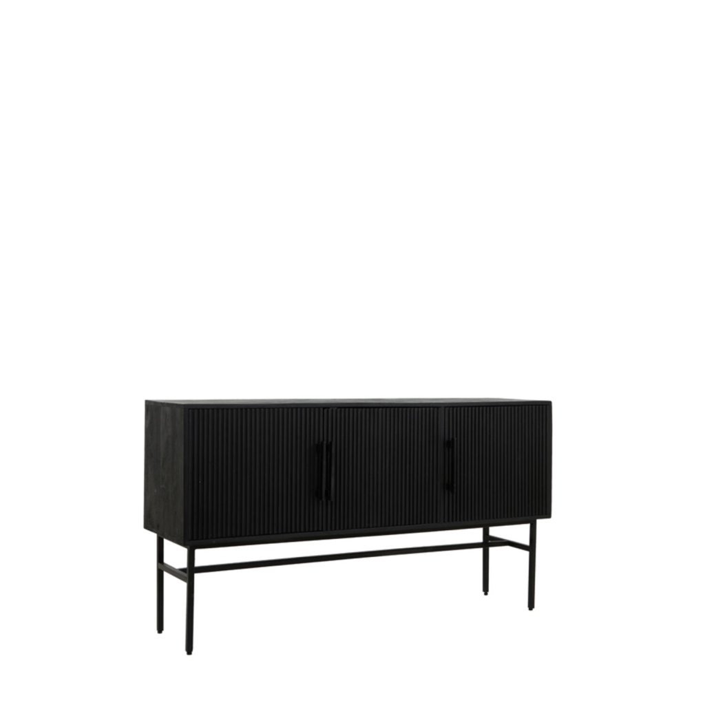 NÁDHERNÁ SKŘÍŇKA Z MASIVNÍHO MANGOVÉHO DŘEVA V SYTĚ ČERNÉM PROVEDENÍ NA ČERNÉM ŽELEYNÉM PODNOŽÍ.