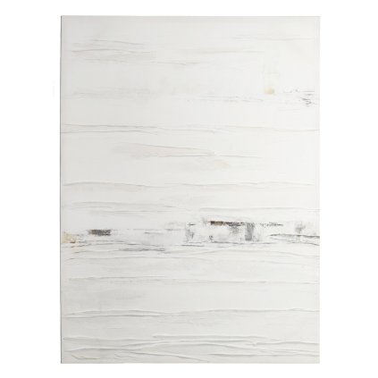 Velkoformátový abstraktní obraz v jemných tónech bílé a šedé, který působí klidně, vyváženě a přirozeně. Minimalistická kompozice s lehkými strukturami připomíná klid mořské hladiny nebo stopy větru v písku - umění, které nechává prostor volně dýchat.