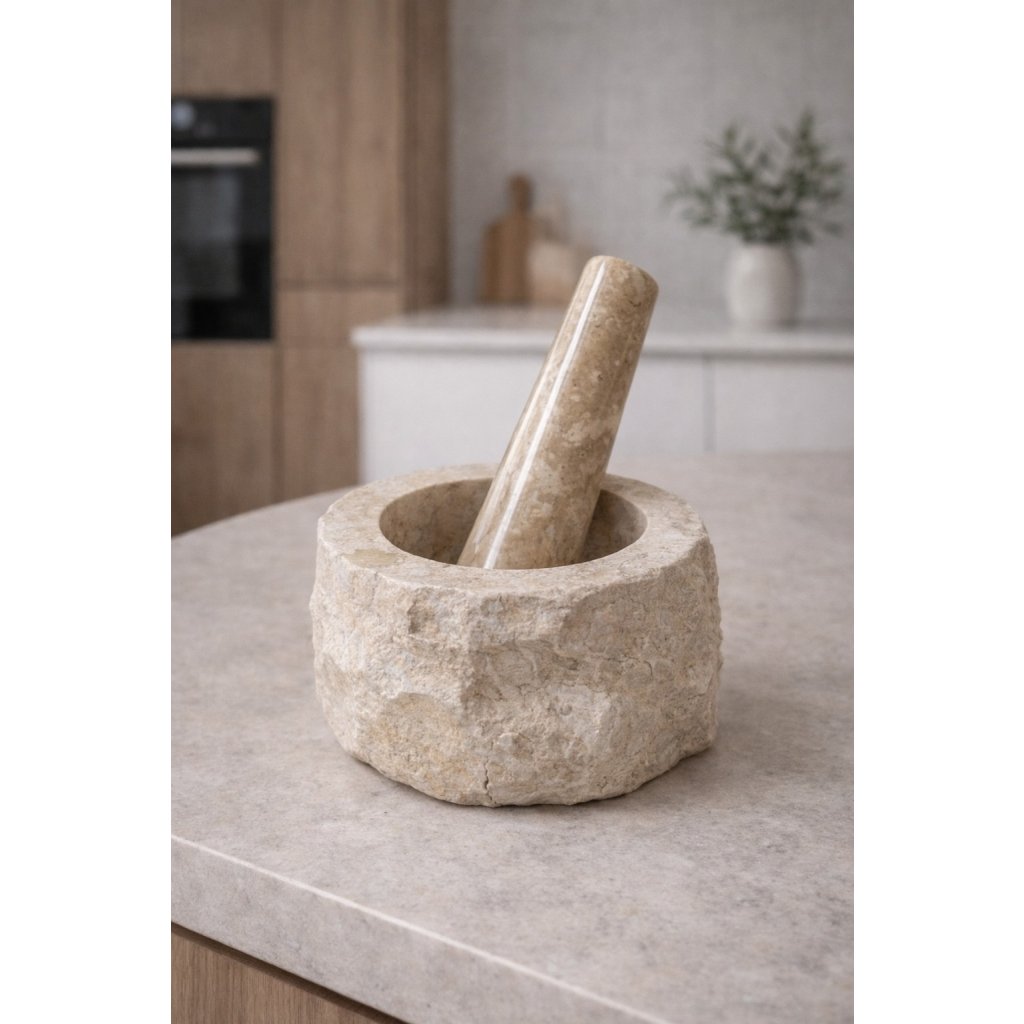 Tento ručně opracovaný hmoždíř z pravého travertinu není jen kuchyňská pomůcka. Je to designový objekt, který zůstává na očích - na pracovní desce, otevřené polici..