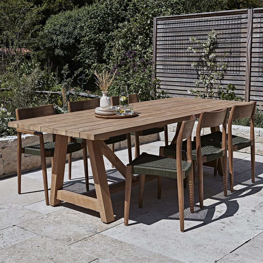 Teakové dřevo je přirozeně bohaté na oleje, díky čemuž je mimořádně odolné vůči povětrnostním vlivům. Pokud jej ponecháte bez ošetření, postupně získá elegantní stříbrnošedou patinu - typickou pro kvalitní exteriérový teak.