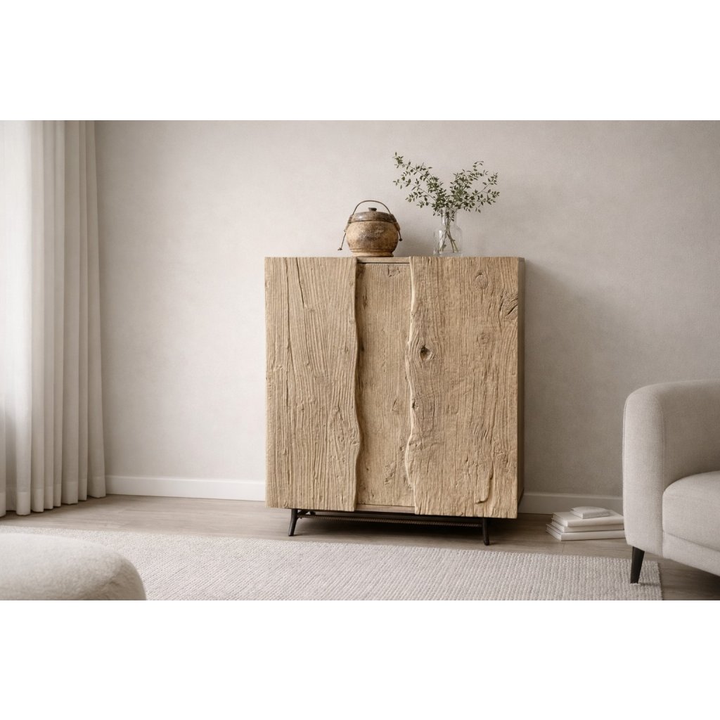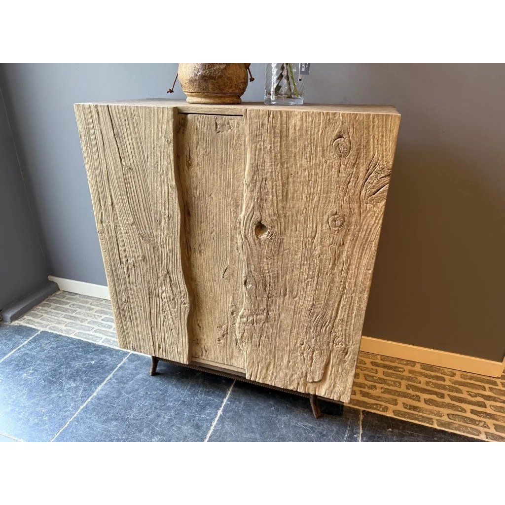 S rozměry 90 x 42 x 105 cm je ideální do předsíně, obývacího pokoje či ložnice. Dvoje dvířka ukrývají praktický prostor, zatímco výrazná kresba dřeva z něj dělají nepřehlédnutelný středobod místnosti. Kovové nožky s jemnou patinou dodávají celku lehce industriální nádech.