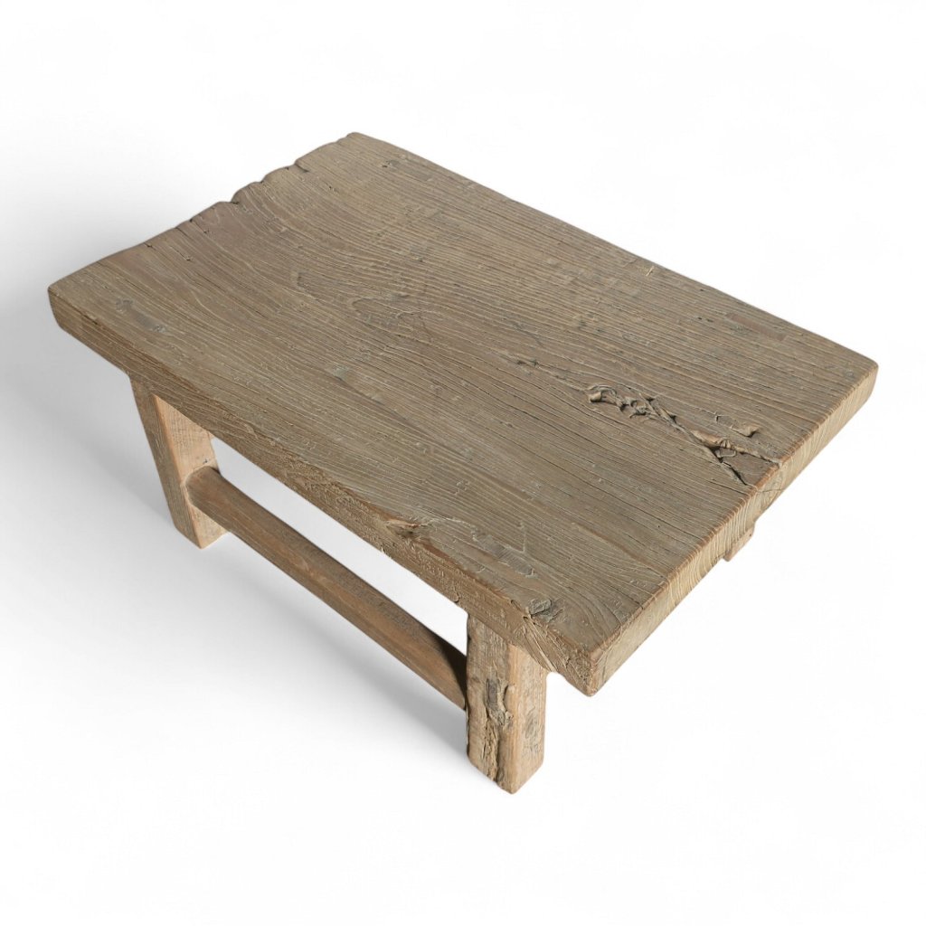 Nízký konferenční stolek ze 100 let starého jilmového dřeva je oslavou jednoduchosti, klidu a přirozené krásy materiálu. Čistý tvar, pevná konstrukce a jemná patina času z něj dělají nadčasový solitér, který v prostoru nepůsobí rušivě, ale naopak ho zklidňuje a sjednocuje.