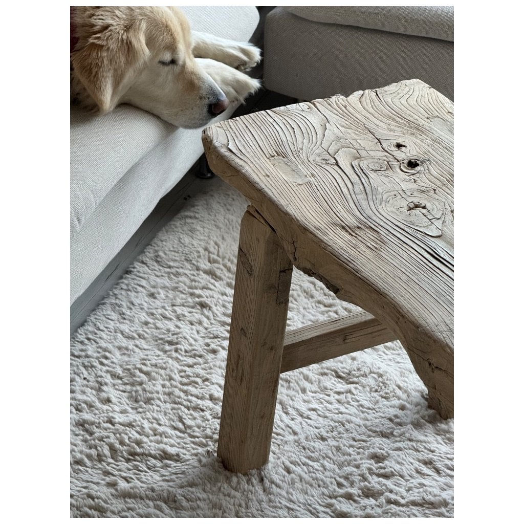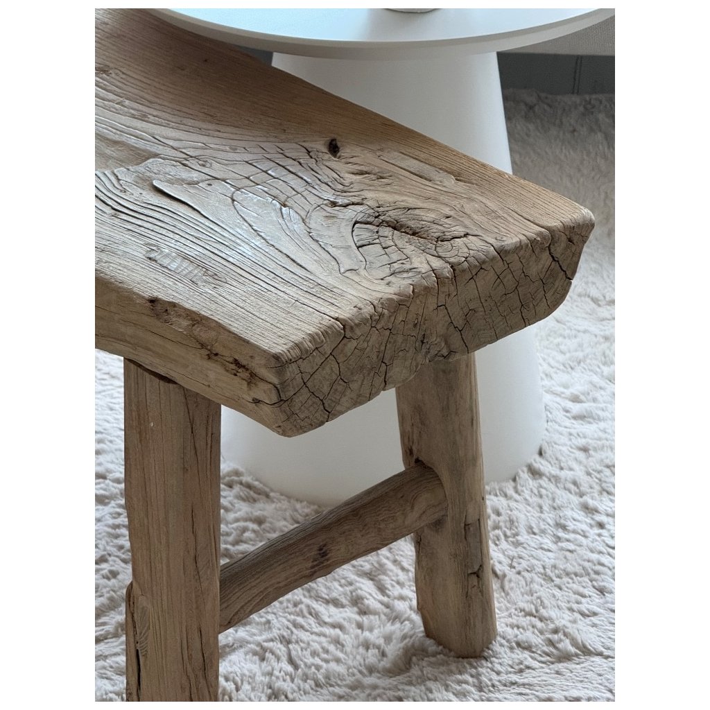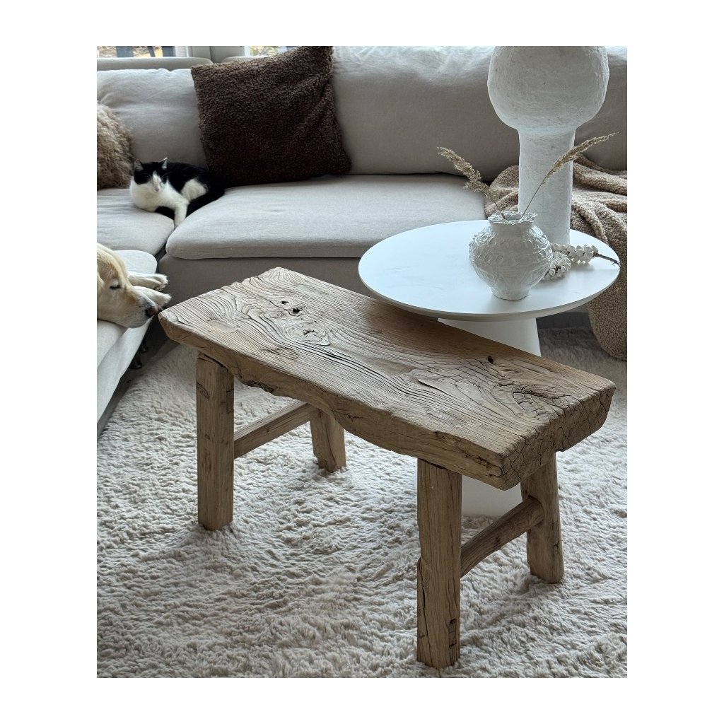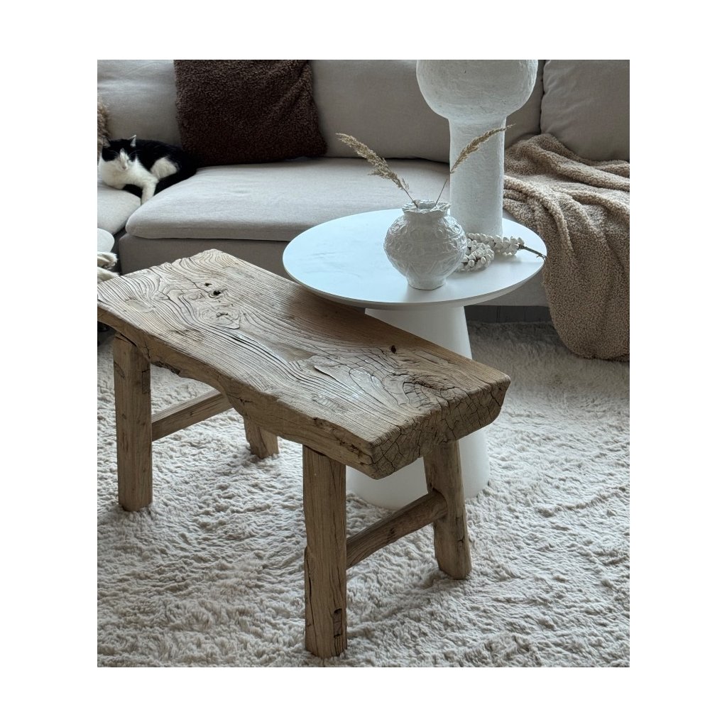 Tento stolek - lavice je vyroben z více jak 100 let starého plaveného dřeva - dřeva, které formoval čas, voda, slunce i vítr. Každá prasklina, sukovitost a nepravidelnost je přirozeným podpisem minulosti. Nic není dokonalé - a právě v tom spočívá její krása.
