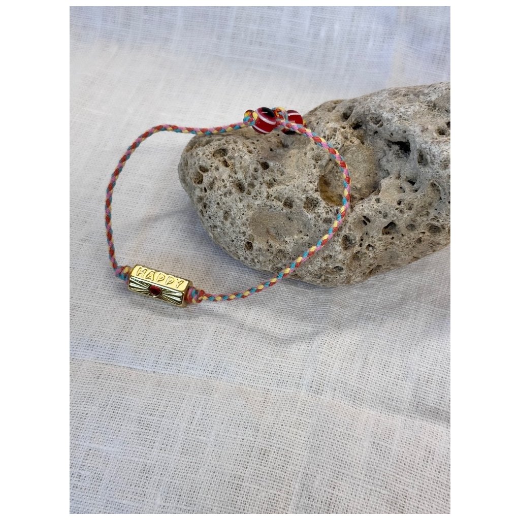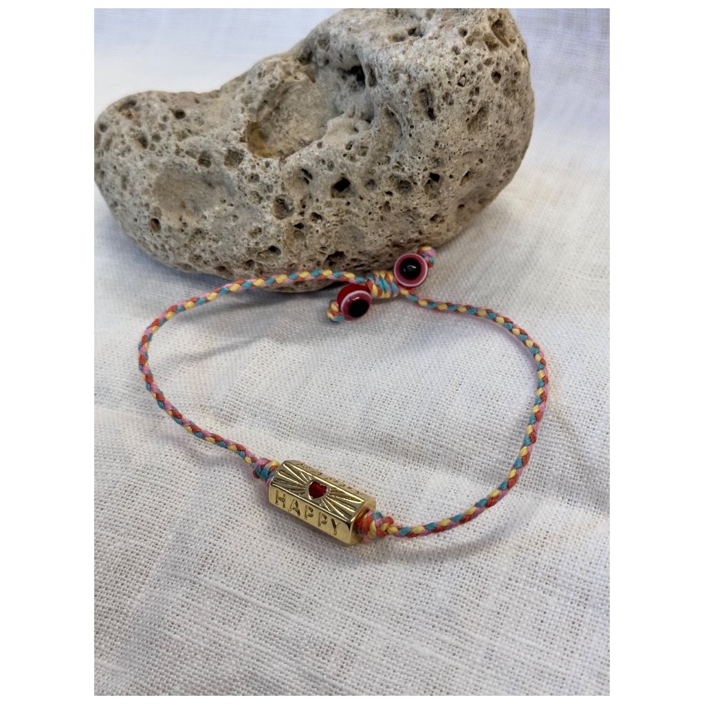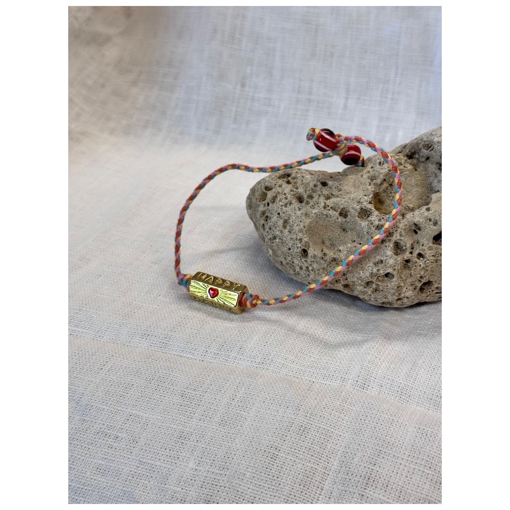 Vneste do každého dne špetku radosti s tímto originálním náramkem v boho stylu. Pečlivě ručně pletený z barevné šňůrky s detailně zpracovaným kovovým prvkem ve zlatém odstínu, který nese nápis HAPPY a jemné srdíčko. Náramek je lehký, hravý a pozitivně laděný - ideální doplněk pro volnomyšlenkáře, milovníky přírody a všechny, kdo si chtějí připomínat, že štěstí se skrývá v maličkostech.