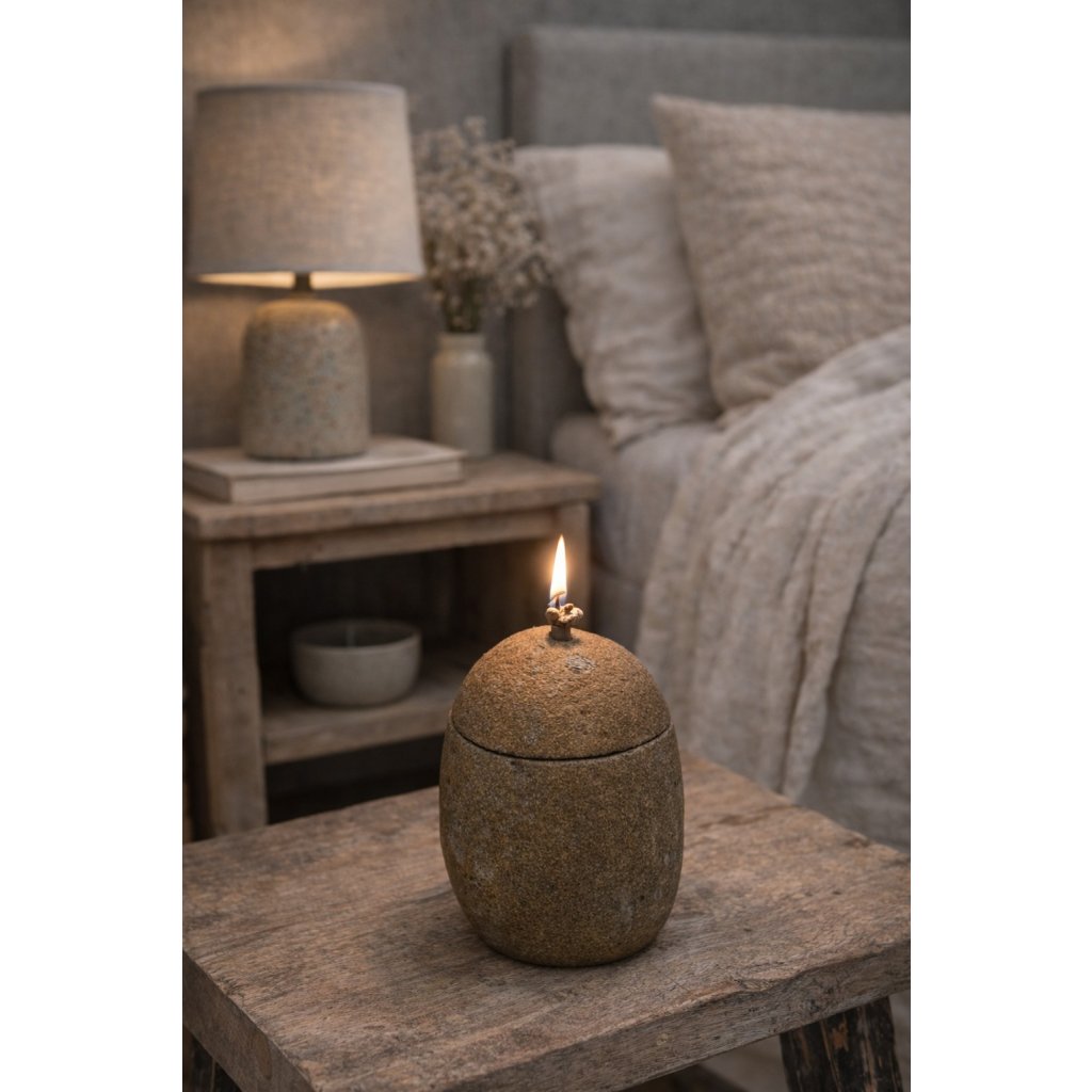 Zapálená lampa působí jako tichý solitér - neoslňuje, ale jemně zahřívá prostor světlem. Skvěle se kombinuje s přírodními materiály, dřevem, lnem a kamenem, v duchu wabi - sabi a klidného minimalismu.