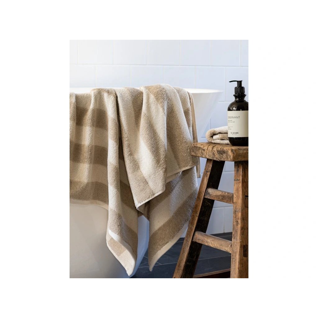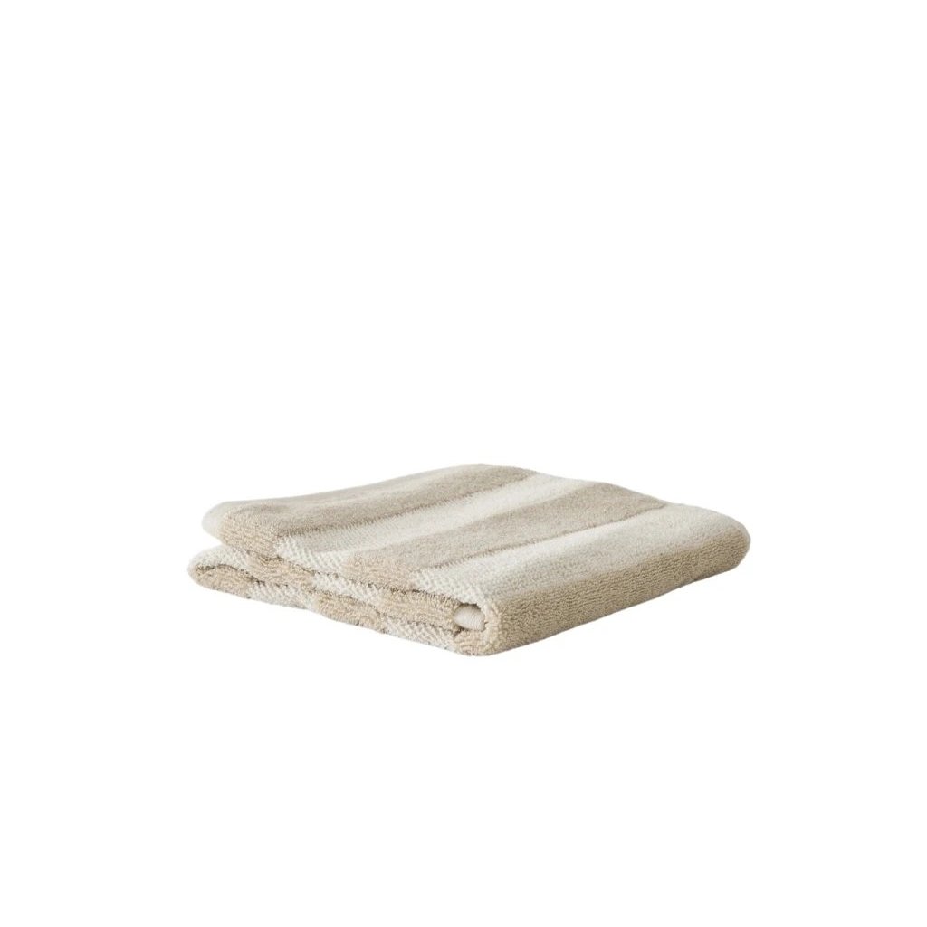 Je vyrobena z organické bavlny s příměsí lnu, díky čemuž je savá, ale také krásně přirozená na dotek. Jemné béžové pruhy dodávají osušce decentní strukturu a nadčasový vzhled, který snadno sladíte s minimalistickým, japandi i přírodním interiérem.