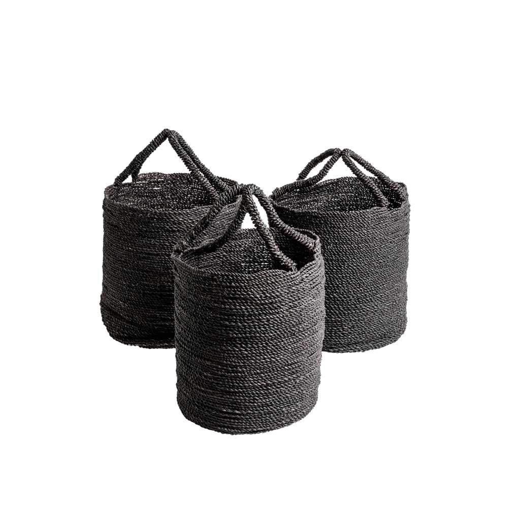 Elegantní, funkční a ručně vyrobené. Tato sada tří košů v moderní černé barvě z přírodní mořské trávy je ideálním doplňkem pro každý interiér.