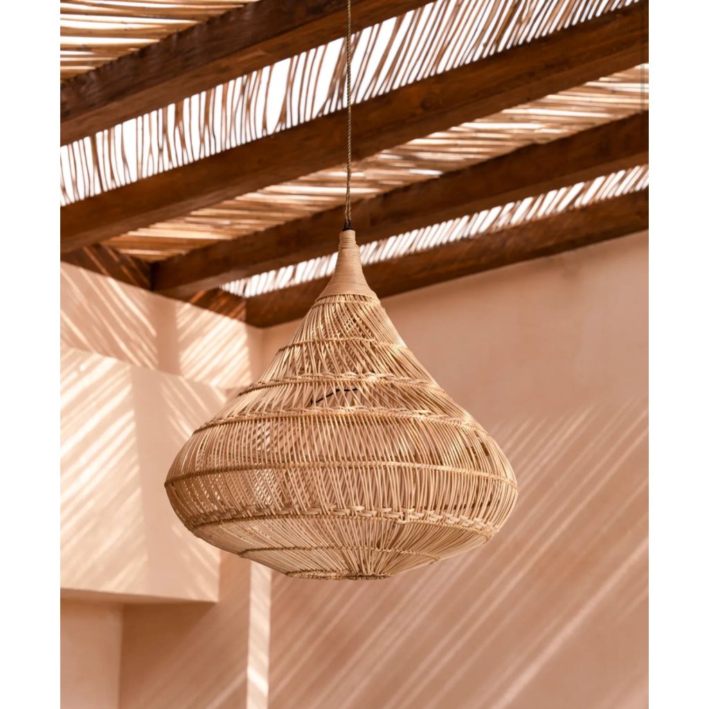 Tento ručně vyrobený závěsný lustr o průměru 55 cm okouzlí každého milovníka přírodních materiálů a nadčasového designu. Díky organickému tvaru kapky a přírodnímu odstínu vytváří jemné světelné vzory, které prostor zútulní a zároveň obzvláštní.
