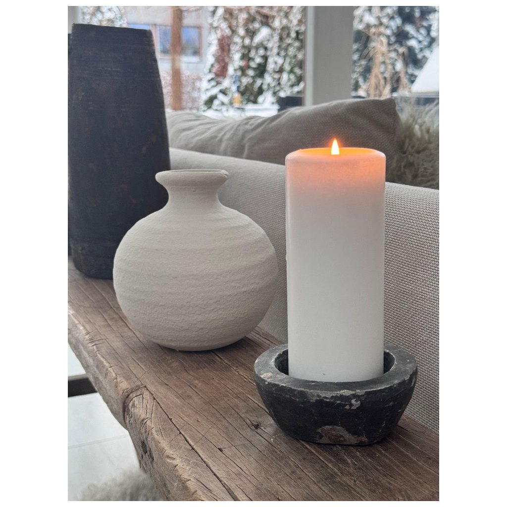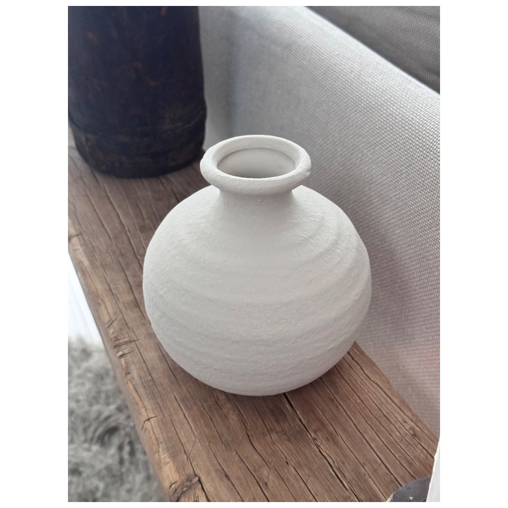 Každý kus je originál. Ruční práce se odráží v lehkých nepravidelnostech, které dodávají váze autenticitu a přirozený charakter. Matný, přírodní odstín krásně pracuje se světlem a vytváří jemné stíny, které zvýrazňují její plastickou strukturu.