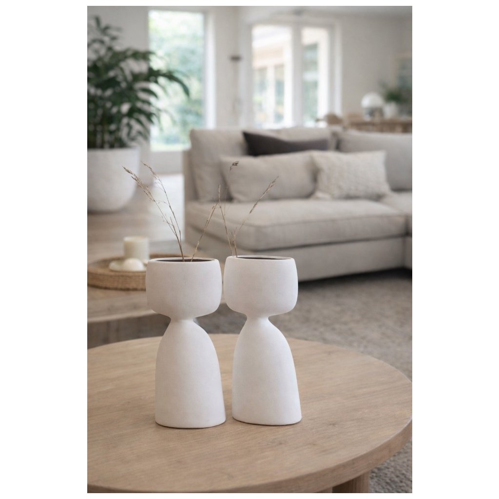 Tato designová váza s matnou bílou glazurou a jedinečnou siluetou je ideálním doplňkem pro každý moderní interiér. Její minimalistický tvar a čisté linie podtrhnou krásu sušených květin a dodají prostoru sofistikovaný nádech.