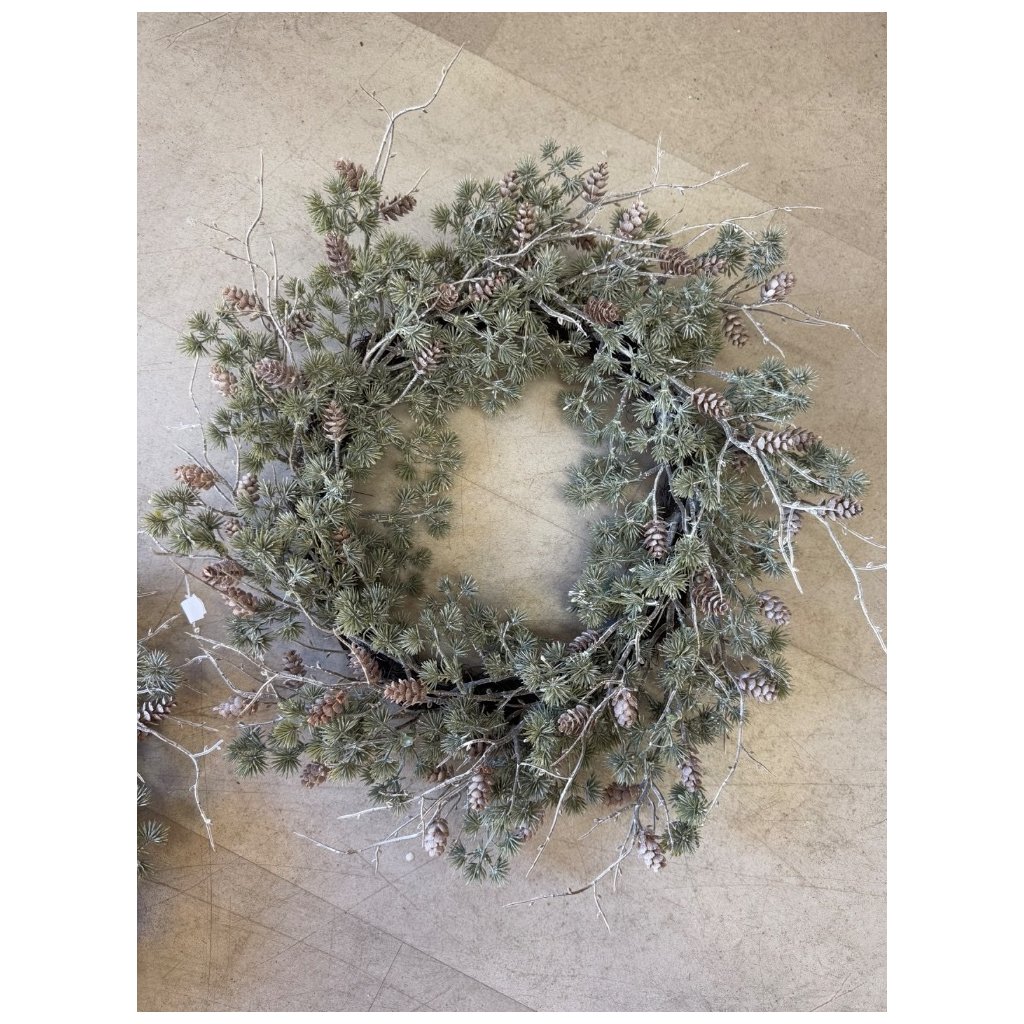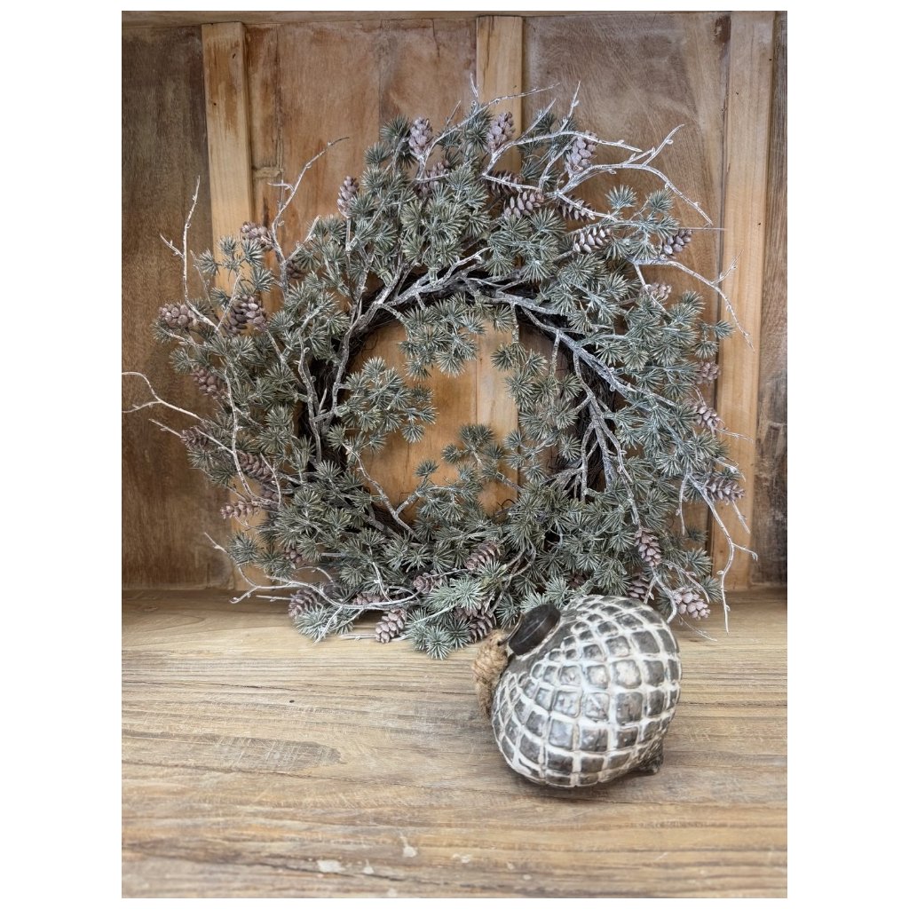 Jemný věnec s drobnými šiškami a zasněženým jehličím přinese do vašeho domova klid a přirozenou krásu severské přírody. Každý detail působí realisticky - od jemného ojínění až po ručně tvarované větvičky.