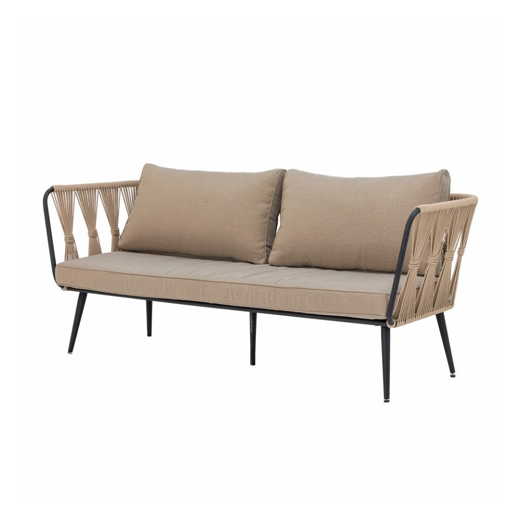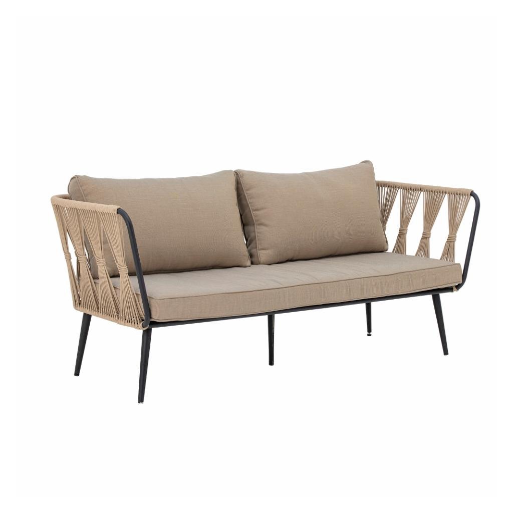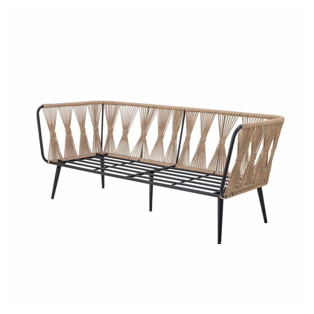 Tato zahradní pohovka v sobě snoubí elegantní nordický design s ručně vázanými detaily, které ji dodávají osobitý šarm. Konstrukce z černého kovu s práškovou úpravou zajišťuje pevnost a dlouhou životnost, zatímco světlehnědé výplety z polyesterového lana vytvářejí jemný, přirozený kontrast.