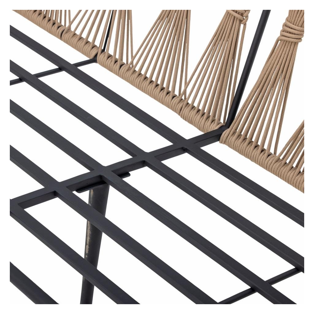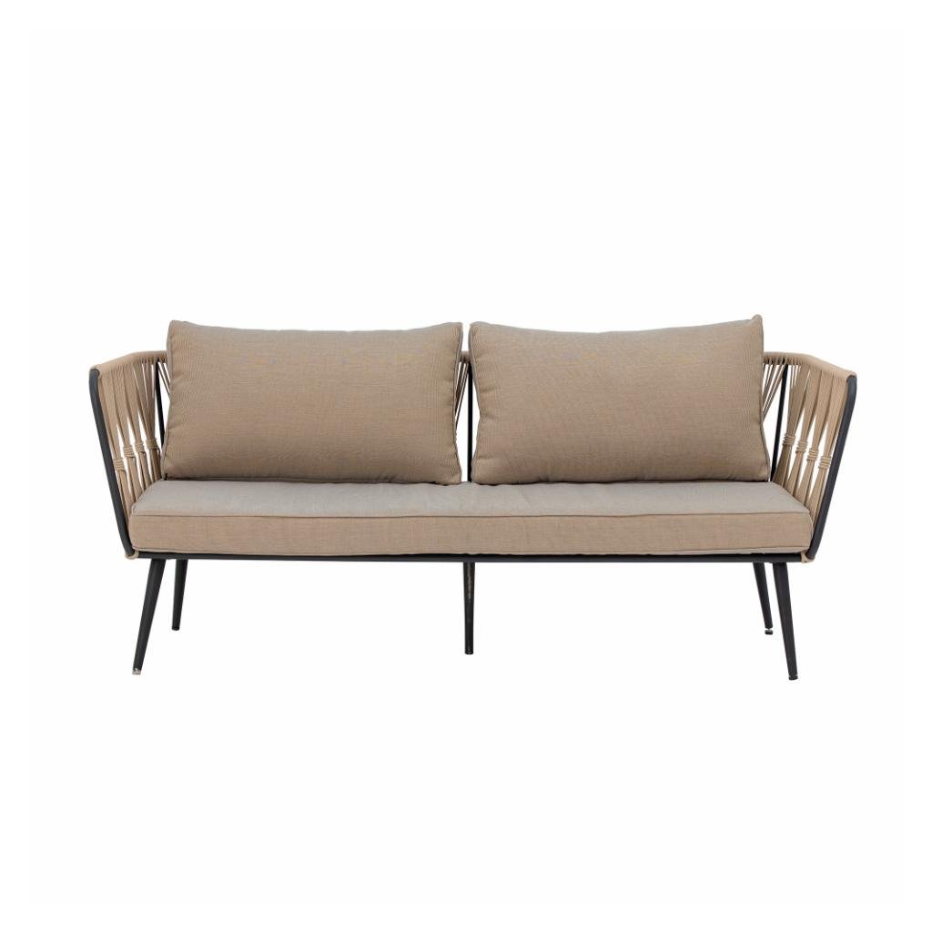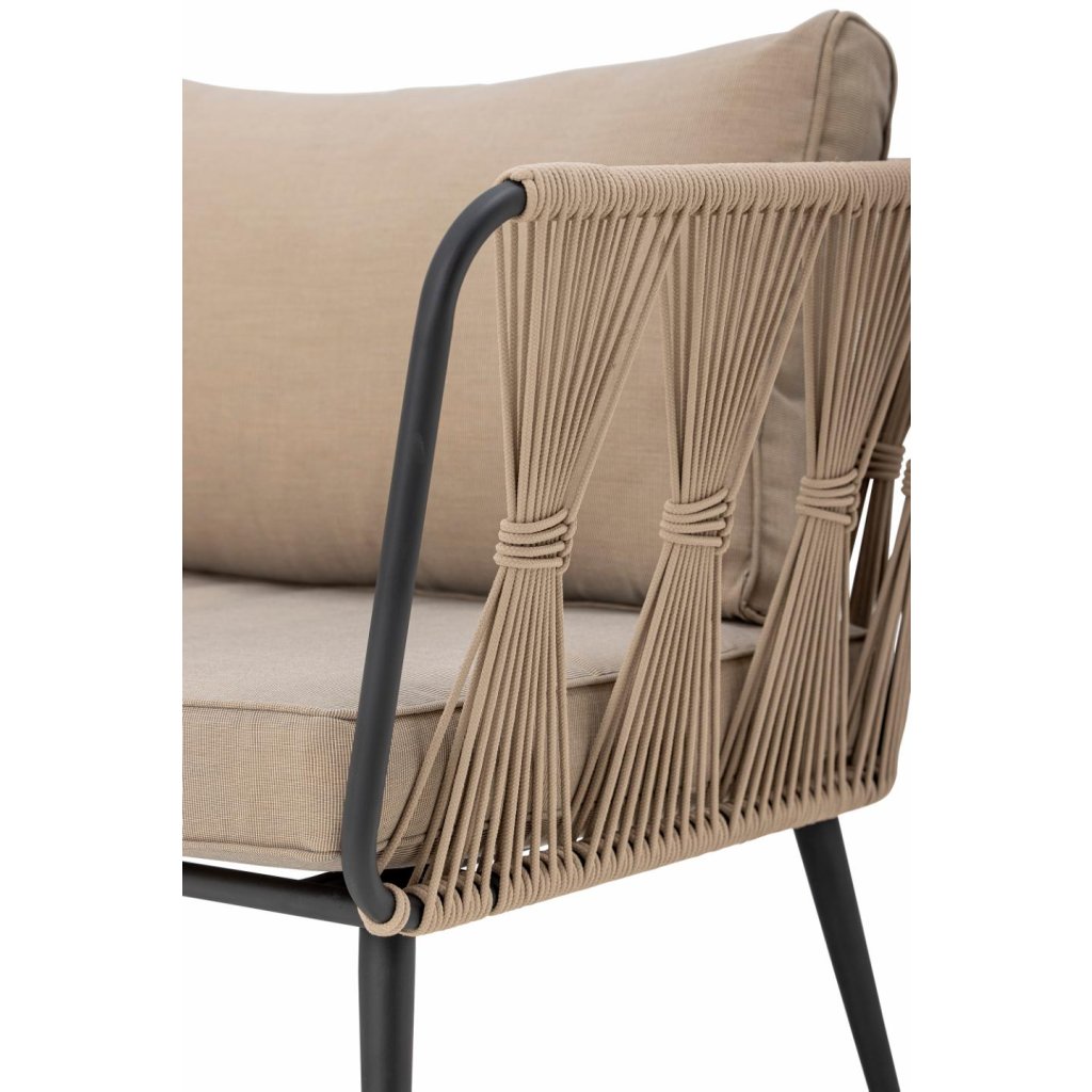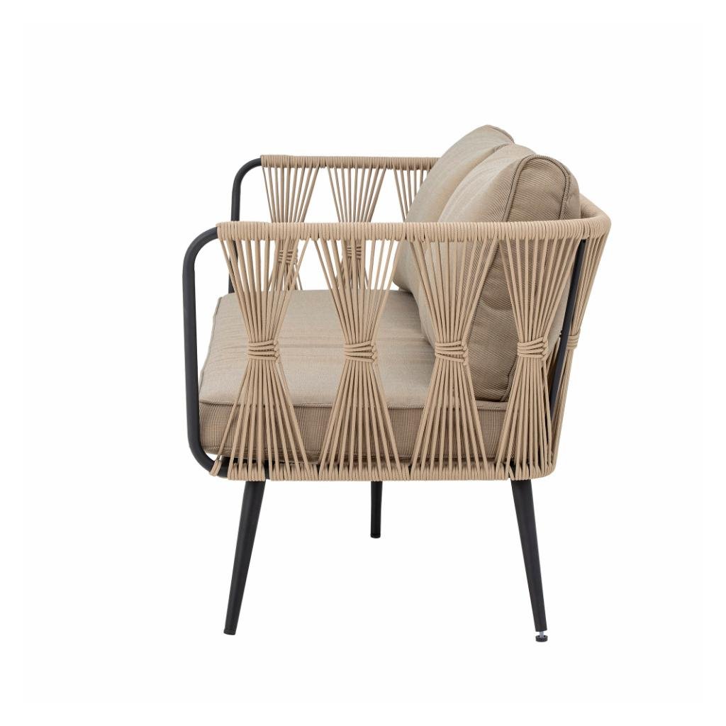 Tato zahradní pohovka v sobě snoubí elegantní nordický design s ručně vázanými detaily, které ji dodávají osobitý šarm. Konstrukce z černého kovu s práškovou úpravou zajišťuje pevnost a dlouhou životnost, zatímco světlehnědé výplety z polyesterového lana vytvářejí jemný, přirozený kontrast.